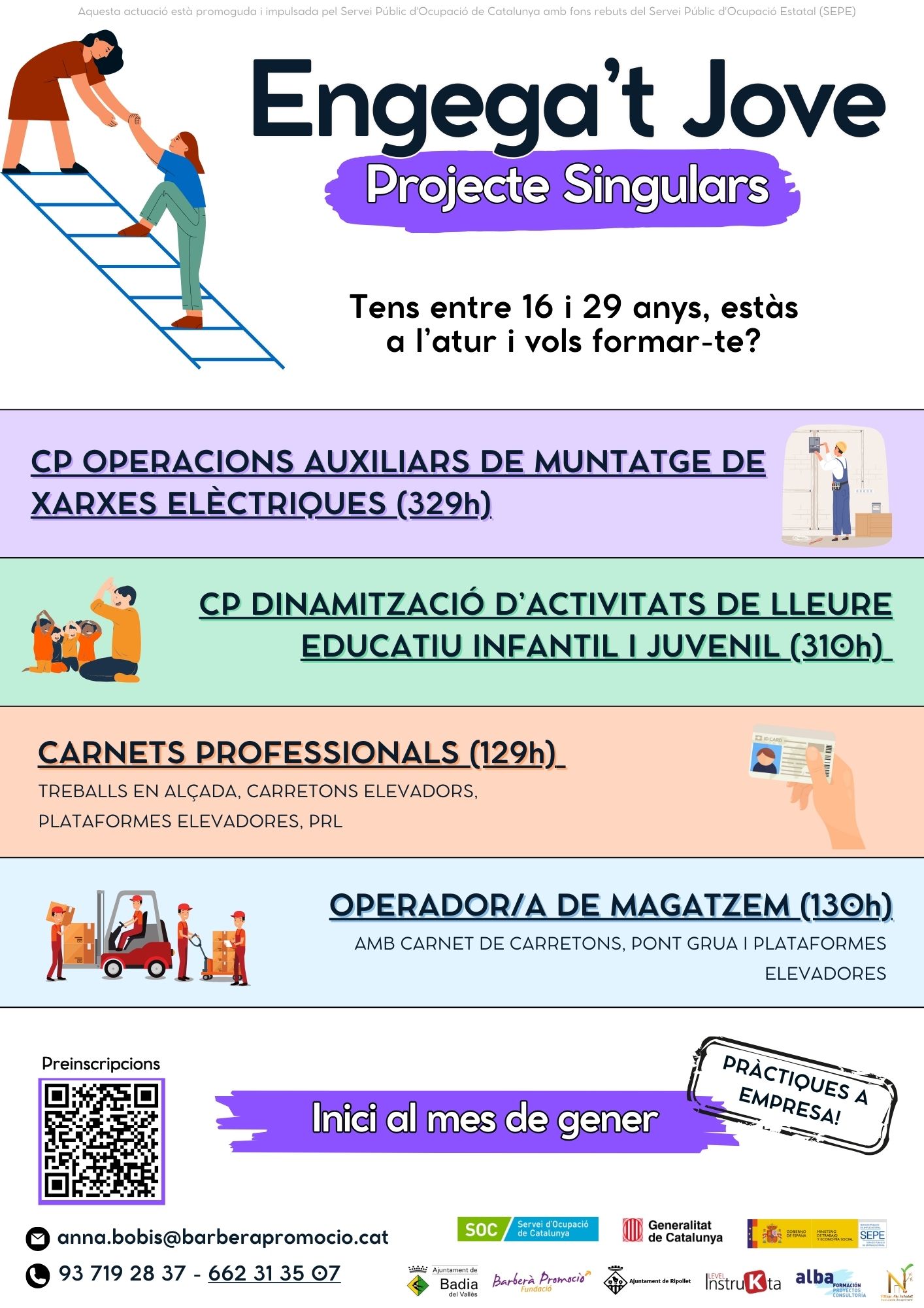 En què consisteix És un projecte formatiu, d’acompanyament i suport en el procés d’orientació laboral i educatiu adreçat a joves d'entre 16 i 29 anys. La finalitat principal del projecte és acompanyar i oferir a les persones participants els recursos i competències necessàries per consolidar el seu objectiu professional, millorant la qualificació i ocupabilitat i detectant les necessitats de personal al teixit empresarial de l'entorn. Els i les joves que formen part del programa del Singulars d’enguany, Engega't Jove!, podran escollir entre 3 itineraris formatius segons els interessos professionals que tinguin i realitzaran una estada de pràctiques en empreses del sector de 80h de duració. Les formacions a realitzar son: