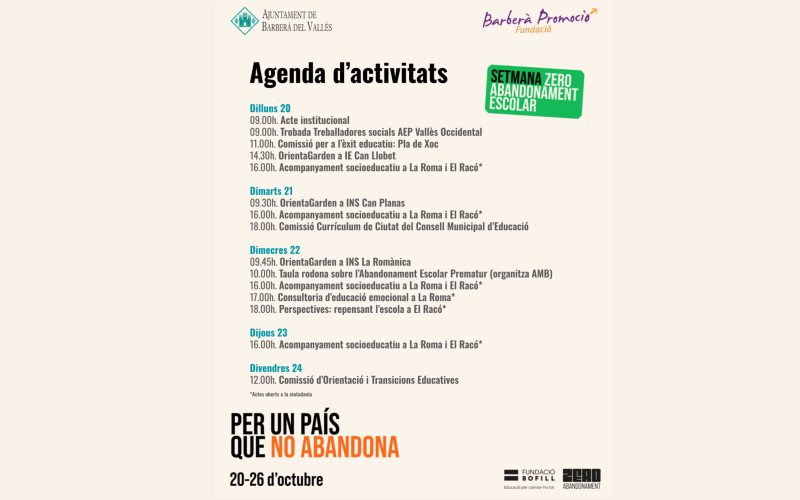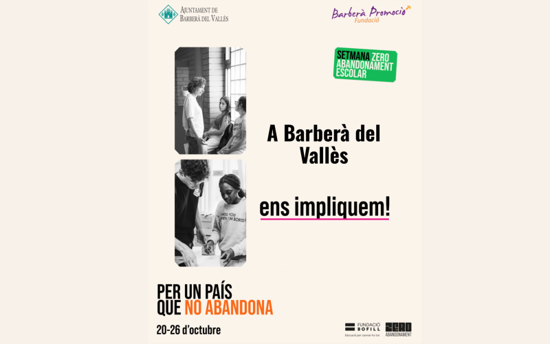 Barberà del Vallès se suma a la celebració de la Setmana pel Zero Abandonament, que organitza la Fundació Bofill i que evidencia el compromís de molts municipis, entitats i col·lectius del país per tal que les persones joves continuïn estudiant. Sota el lema “Per un país que no abandona”, entre el 20 i el 26 d’octubre se celebraran més de 100 actes arreu de Catalunya, entre xerrades, seminaris, exposicions, tallers de teatre o programes de ràdio en què els joves prenen la paraula. Totes les activitats previstes es poden consultar al web de la Plataforma Zero Abandonament.