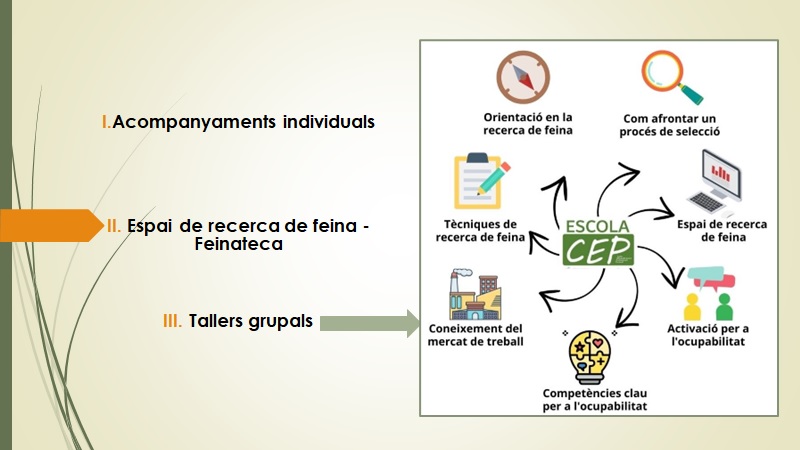 L’Escola CEP s’ocupa d’acompanyar en la cerca de feina i/o formació, millorar l’ocupabilitat, activar prelaboralment i treballar pel