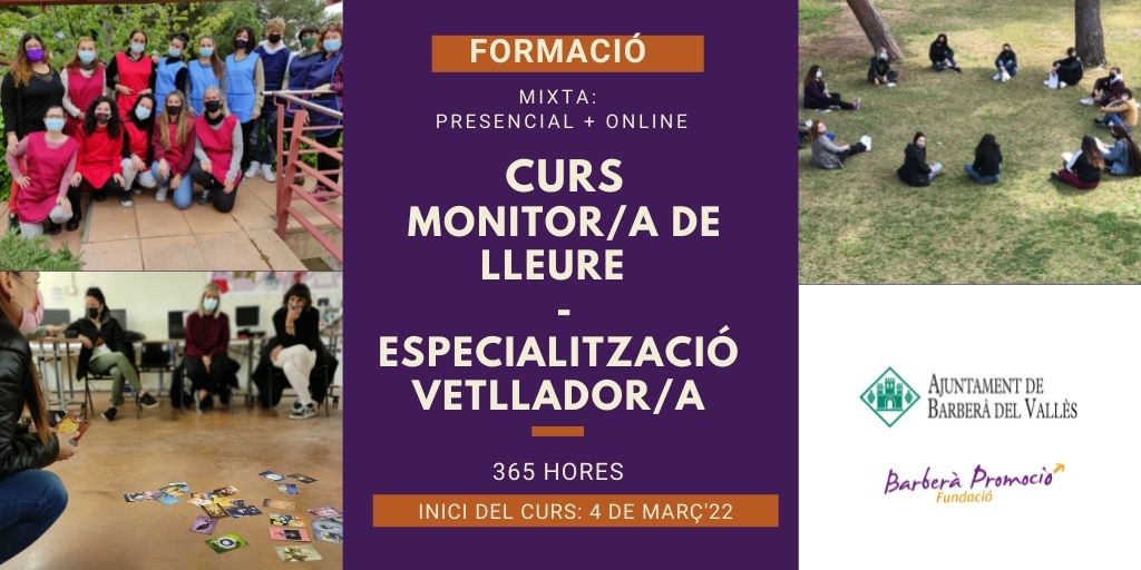 El curs, de 365 h. de durada, data d’inici prevista el 04-03-22 i modalitat d’impartició mixta (presencial i on line), inclou l’obtenció de la titulació oficial de Monitor/a de lleure expedida pel Departament de Joventut de la Generalitat de Catalunya (prèvia superació de curs i presentació de Memòria Final).