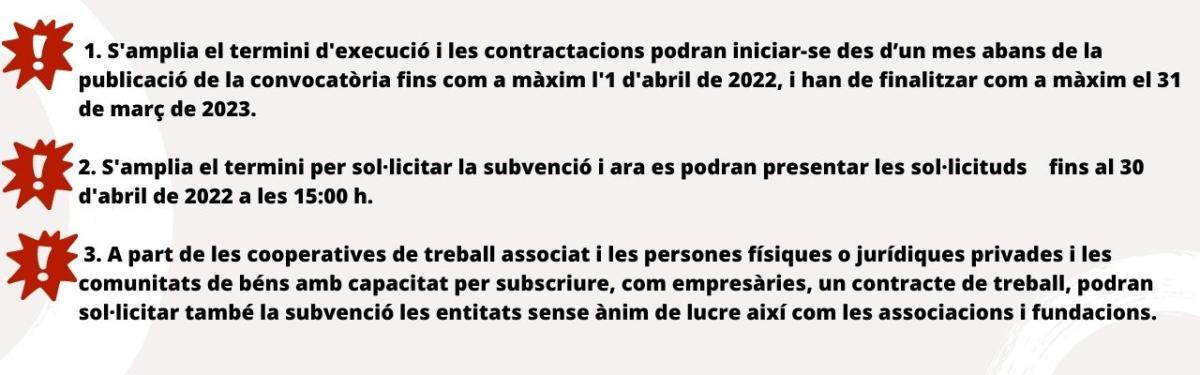S'AMPLIEN ELS TERMINIS per iniciar les contractacions i per presentar les sol·licituds en les convocatòries de subvencions del Servei d'Ocupació de Catalunya per fomentar la contractació de persones joves menors de 30 anys (en pràctiques o indefinits):