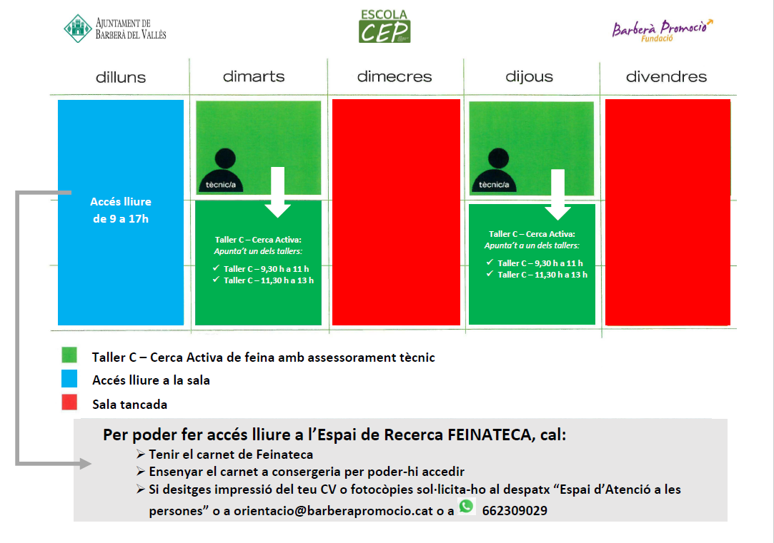 Dimarts i dijous: Taller C - Cerca Activa de feina amb acompanyament i assessorament de personal tècnic especialitzat. Hi haurà 2 torns (caldrà apuntar-se al que es desitgi):