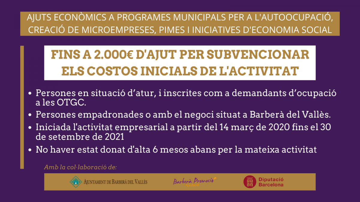 L’Ajuntament de Barberà del Vallès, amb el suport tècnic i econòmic de l’Àrea Desenvolupament Econòmic, Turisme i Comerç de la Diputació de Barcelona, té la voluntat d’establir una línia d’ajuts econòmics per al foment de l’autoocupació de les persones desocupades del municipi.