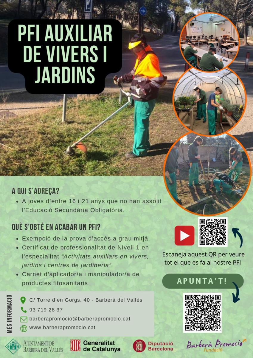 El Programa de Formación e Inserción (PFI) es una formación para jóvenes, de 1.000 horas, que pretende ayudarlos a definir su proyecto personal y profesional. En la Fundación Barberà Promoció se imparte la especialidad “de Auxiliar de viveros y jardines”