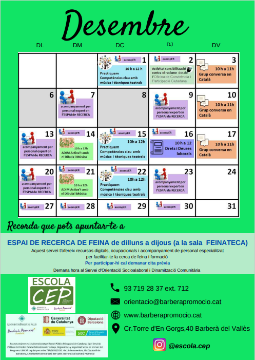 El inicio del nuevo curso ya está aquí. La firme apuesta del Ayuntamiento de Barberà del Vallès para dar un servicio de orientación sociolaboral y mejorar la empleabilidad del municipio, se ve reflejado en todos los talleres que ofrece la Escola CEP en Barberà Promoció.