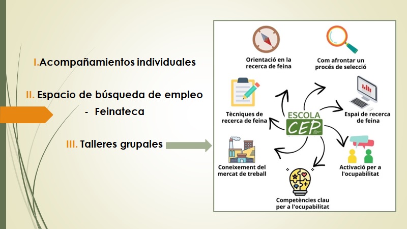 La Escola CEP se ocupa de acompañar en la búsqueda de trabajo y/o formación, mejorar la ocupabilidad, activar prelaboralmente y trabajar el